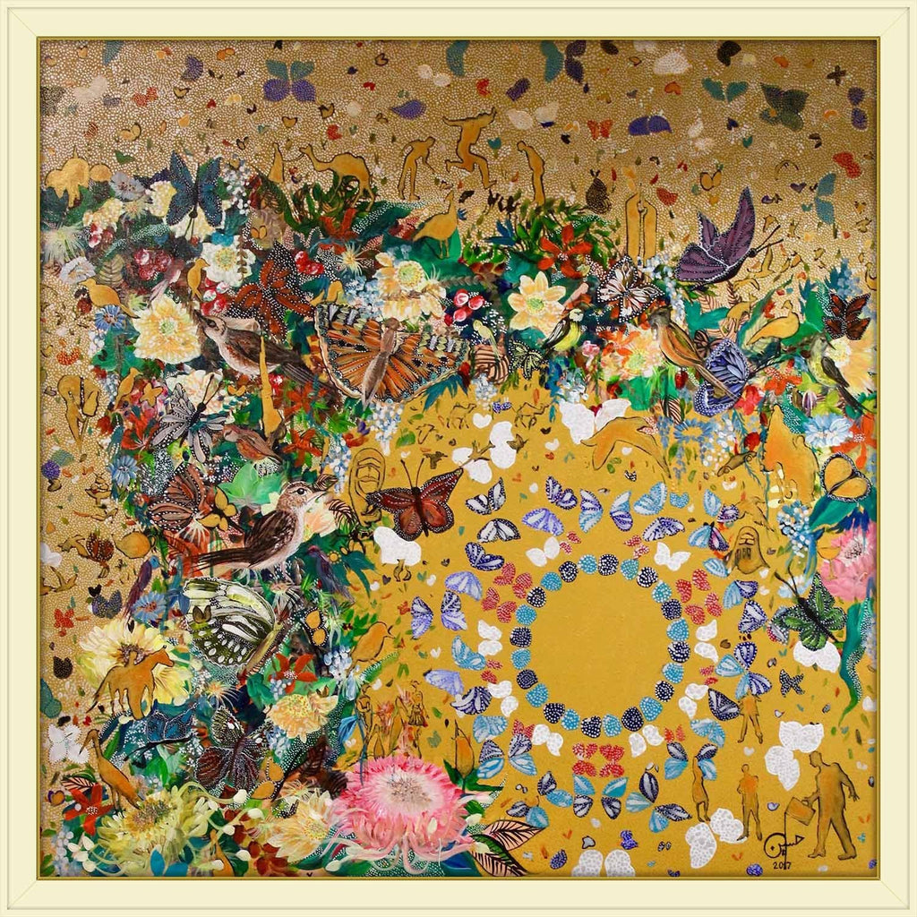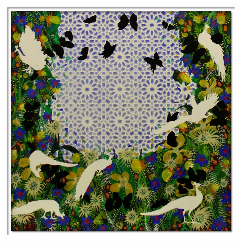 “When I paint nature with peace in the wilderness, I feel inspired to create a harmonious and joyful community. My compositions burst sensuality and life. I can see them as exuberant souls. Rich colours inspire me most, and then to compose the community from the heart is what keeps the process fresh and new. As I develop my thought processes and start new paintings, I am more inclined towards paradisiacal perfection and the feeling of submerging into the depth of nature.