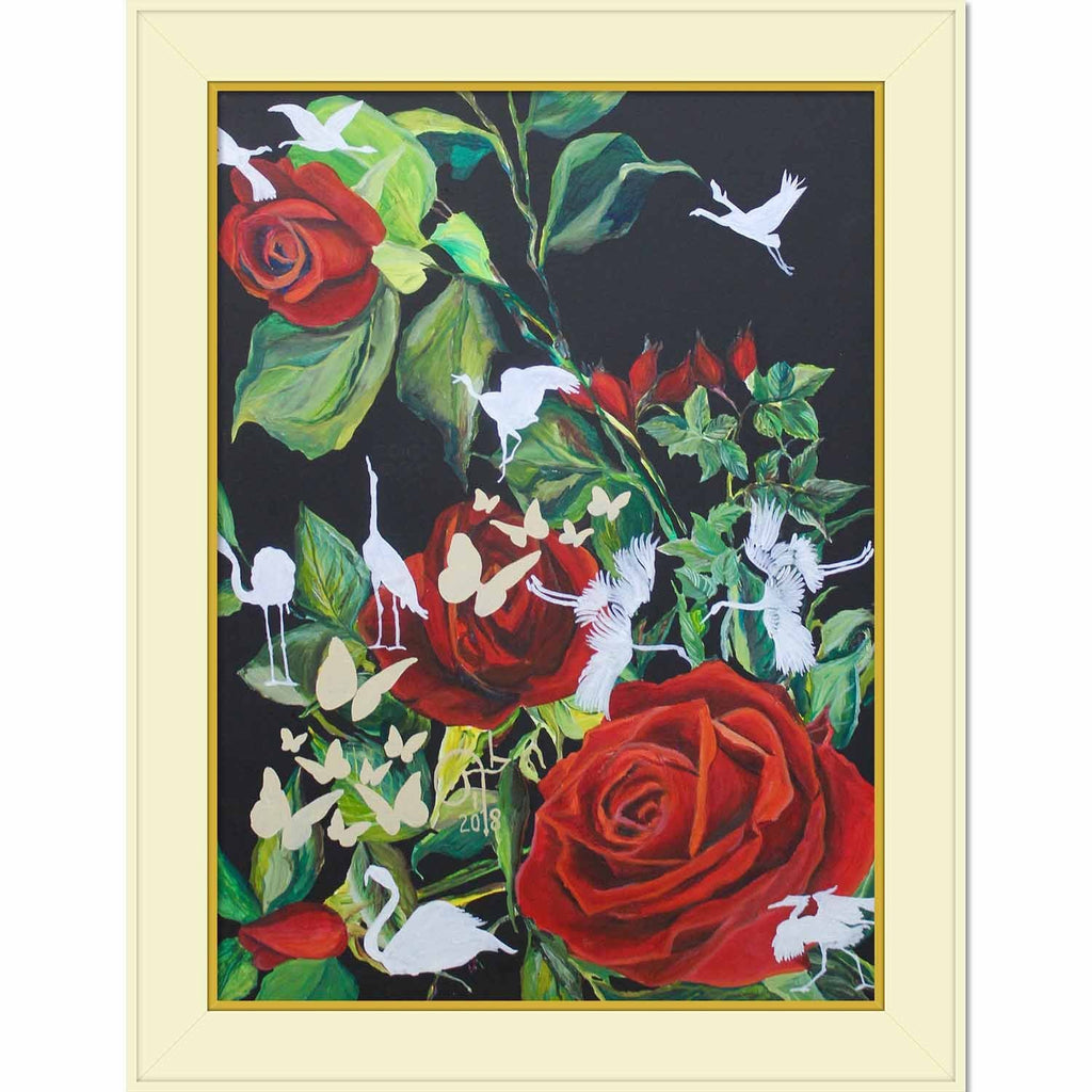 There is something truly celebratory about flowers, birds, and butterflies, there is liveliness. Their transitory nature makes the moment an occasion that deserves to be savoured and remembered with attention and care, drama and boldness. Throughout the painting process, I remain aware of this and invest the painting with experience of the moment.