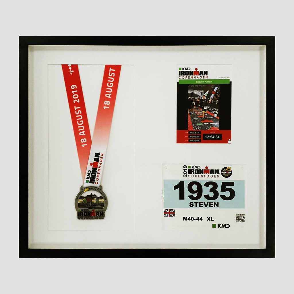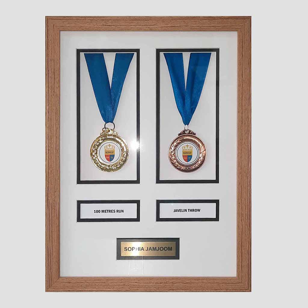 Medal framing is a specialized technique designed to preserve and showcase your achievements on a wall. It incorporates the medal, a plaque, and photo within the same frame, creating a memorable display.