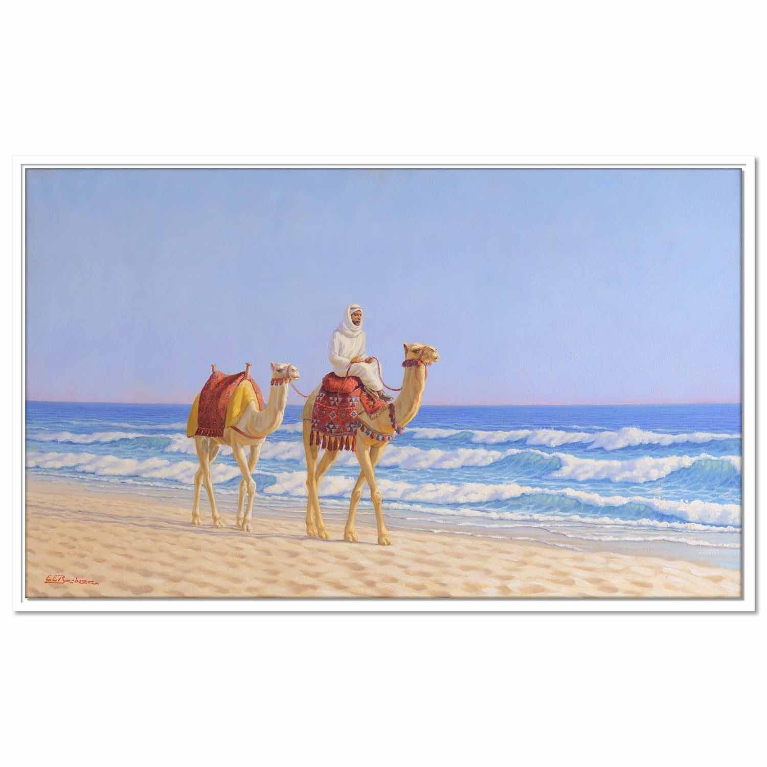 In this work painted for his solo 2015 Dubai exhibition, Edilson Barbosa shows a very common scene in the UAE: the contrast of the desert camels with their rich traditional ornaments and the beautiful blue gulf sea as background.