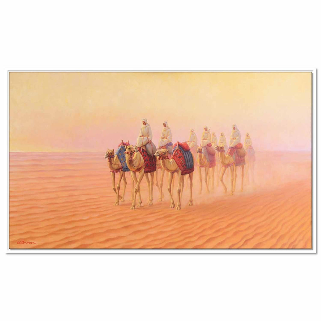 A great success during his 2015 Dubai solo exhibition, this desert scene was inspired by the Arab travelers and their traditional clothes, crossing the Gulf Desert, having a sunset in the background which brings a poignant light effect.