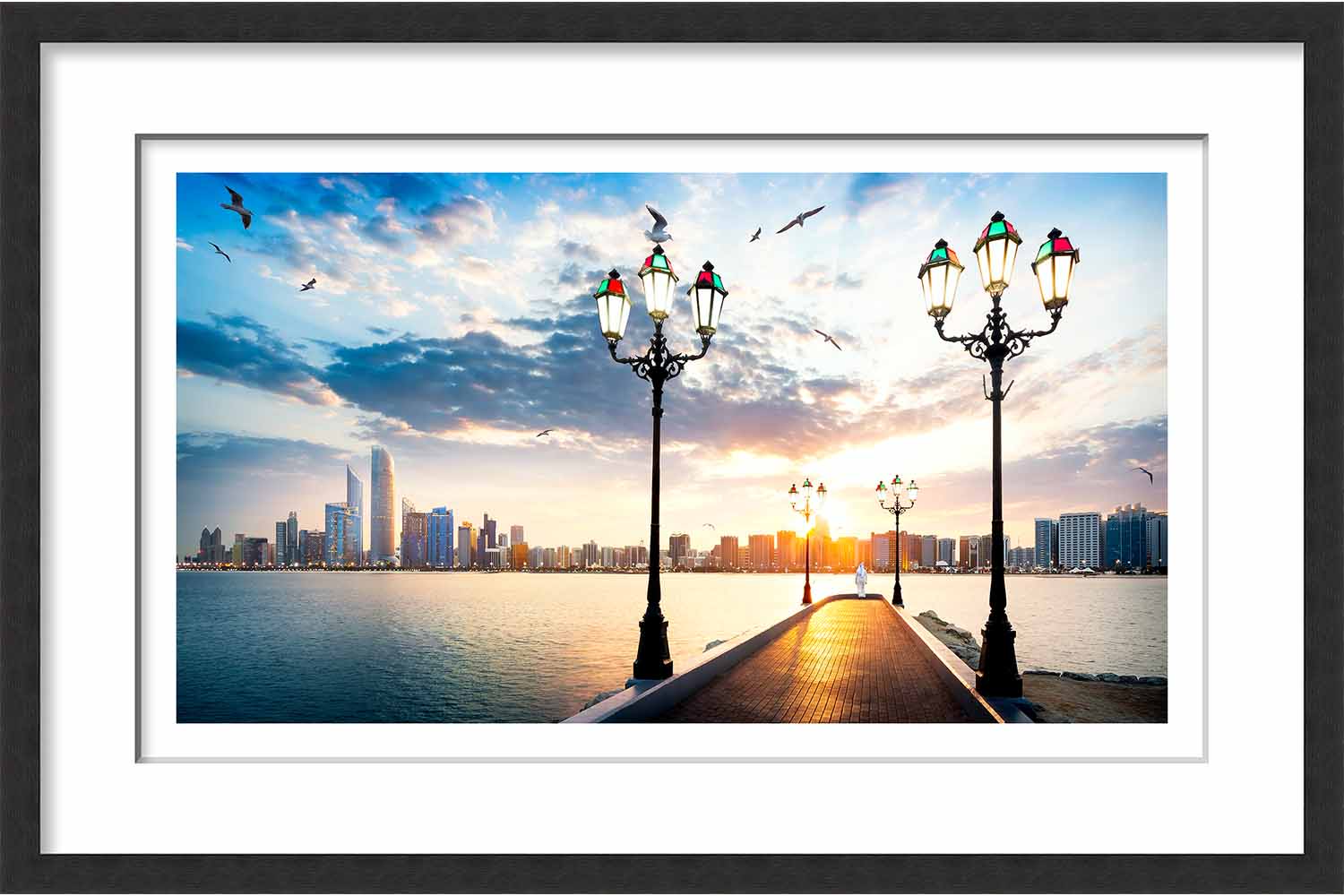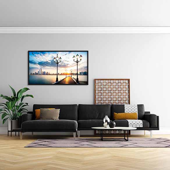 Canvas stretched on 2.5 cm deep wood or stretched & framed with 1.8 x 3.5 cm black L-shaped floating frame.