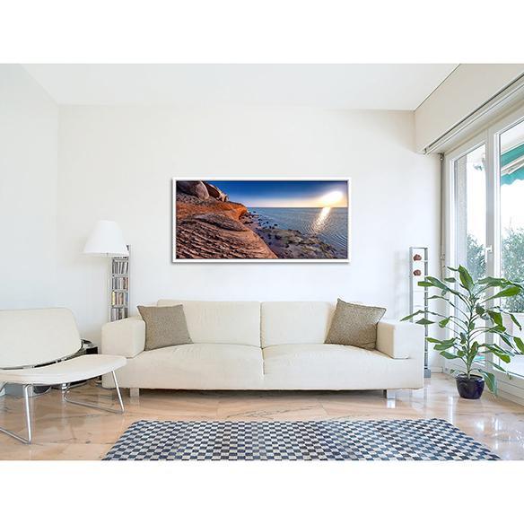 Canvas stretched on 2.5 cm deep wood or stretched & framed with 1.8 x 3.5 cm black L-shaped floating frame.