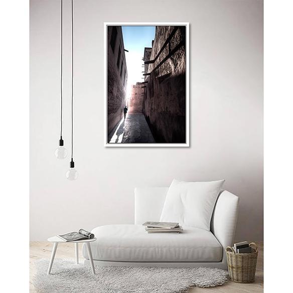 Canvas stretched on 2.5 cm deep wood or stretched & framed with 1.8 x 3.5 cm black L-shaped floating frame.