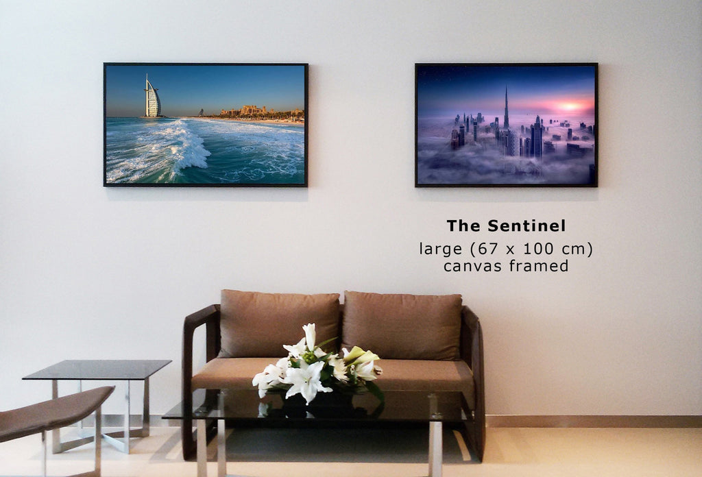 Canvas stretched on 2.5 cm deep wood or stretched & framed with 1.8 x 3.5 cm black L-shaped floating frame.