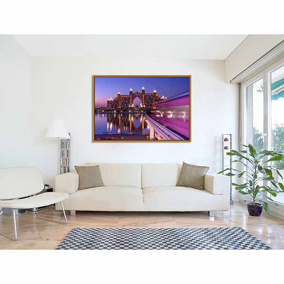 Canvas stretched on 2.5 cm deep wood or stretched & framed with 1.8 x 3.5 cm black L-shaped floating frame.